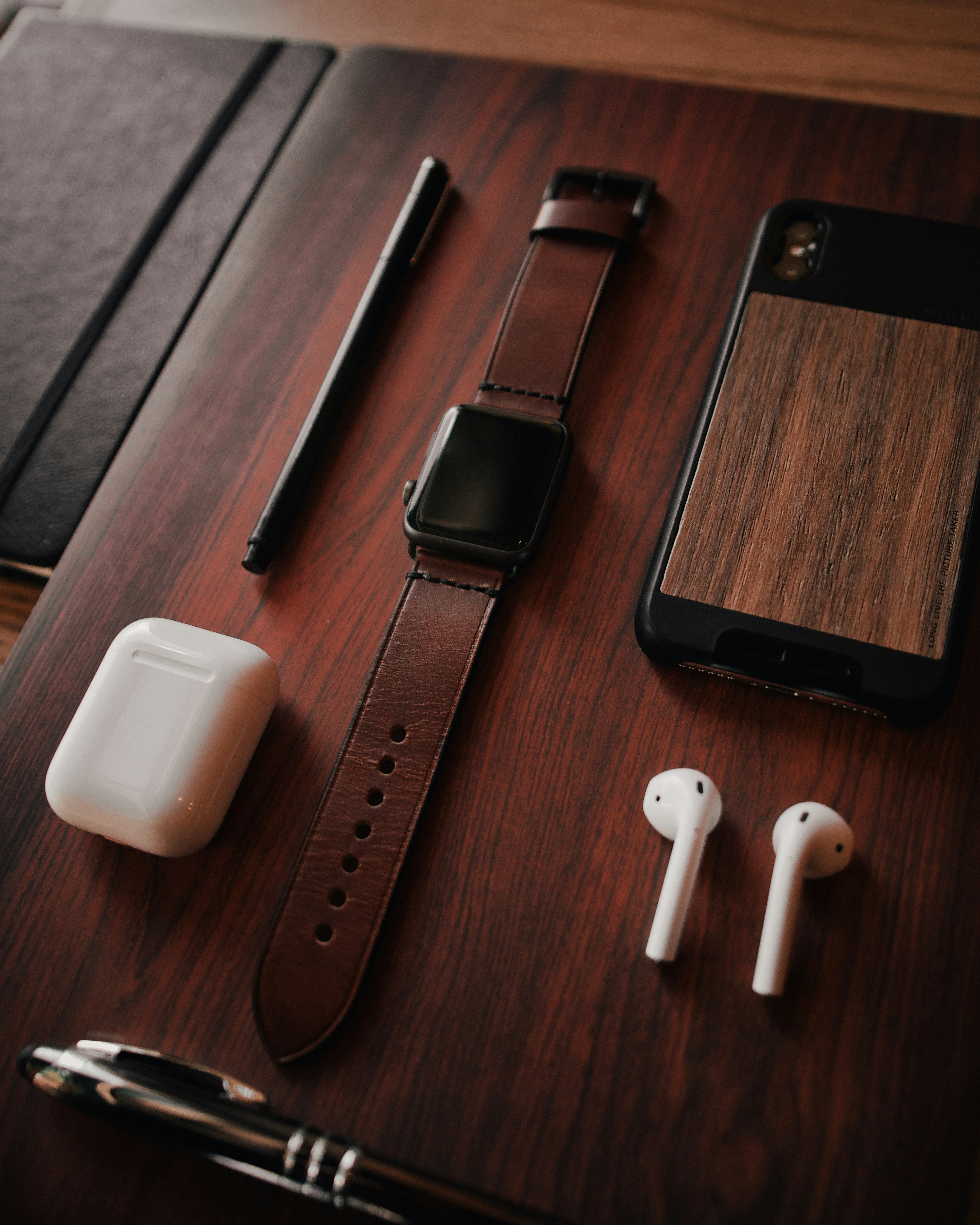 Black Aluminum Apple Watch With Brown Leather Band Apple Airpods With Case Black Pen And Brown And Black Case On Brown Wooden Surface Photo Free Computer Image On Unsplash